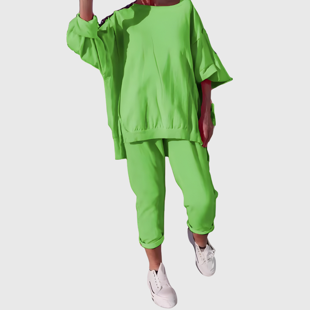 Unser beliebtes Lounge-Set ist die perfekte Wahl für alle, die Gemütlichkeit und Stil im Alltag kombinieren möchten. Mit seinem lockeren Schnitt und modernen Details begleitet es dich beim Entspannen zu Hause oder beim Erledigen von Alltagsaufgaben. Viele Kundinnen lieben diesen Look – jetzt neu in angesagten Farben!